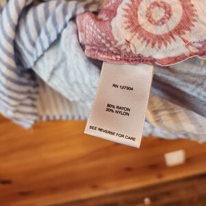 Stylish button-up shirt with blue and red pattern. Features unique red patterned accents on the sides. 30" long, 21" pit to pit.