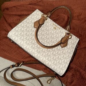 Chic Michael Kors satchel with signature MK pattern. Features tan leather accents. Perfect for everyday elegance.