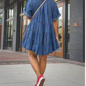 Chic and casual, this blue denim mini dress from FREE PEOPLE features a flattering V-neck, roomy cap sleeves, and a breezy tiered skirt.