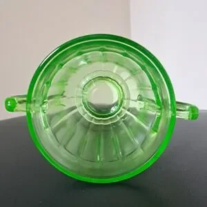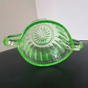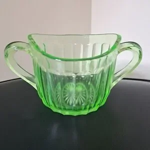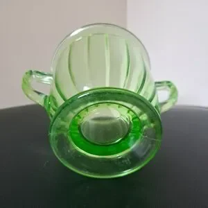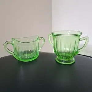 When I purchased these, I was told it was a sugar and creamer set. Seems awkward to pour cream out of either one, although the shorter bowl does have a low curve, so maybe you know! Either way, they are both in great condition, with some as-made rough seams and a scratch on the shortie, but no serious glass damage over the years, which is really incredible for probably being close to 100 years old. The short one is @3" tall and the taller one is @3 3/4" tall. They are uranium glass, which means they glow beautifully under UV light.