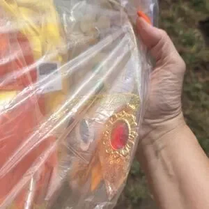 Enchanting yellow princess costume featuring a vibrant dress with orange accents. Includes a gold crown and matching earrings for a complete royal look. Perfect for imaginative play and costume parties.