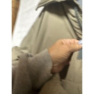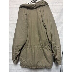 This Vintage The North Face Goose Down Coat Jacket in XL size is a classic beige puffer jacket with a full zip closure and button accents. Made with nylon outer shell material and insulated with down, it is perfect for all seasons and outdoor activities like riding, hunting, skiing, and hiking. The jacket features a lined interior, zippered pockets, and a solid pattern, making it a versatile and stylish addition to any man's closet. The North Face logo adds a touch of authenticity to this vintage piece. Miltary Style