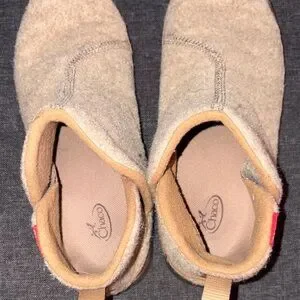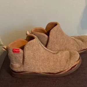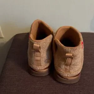 Comfortable tan slip-on shoes. Ideal for everyday wear. Perfect for cold weather approaching. Felted booties