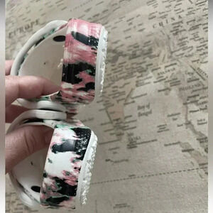 Yellow, black. Pink & teal tie dye crocs - in almost new condition. CROcS cutout on sides.
