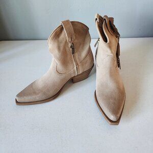 "NEW" Gorgeous Tan/Taupe Suede Western Style Bootie By Sundance. Pull on Style with Inside Zip & Top Loop Pulls, Pointed Toe, Side Fringe Accent, Leather Upper, Lining & Cushioned Foot Bed, Man Made Soles with 1.3/4" Stacked Western Heel, Made in Italy, New, Never Worn, Only Tried On:) Rt.225.00 approx. Size 38/ 8, Foot Bed Measures 10" for Reference. * Super Cute & Great Gift.