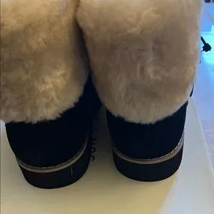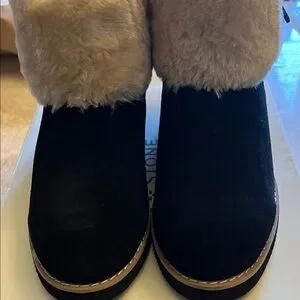 Chic winter boots with a plush cream cuff. Durable black exterior for cold weather.