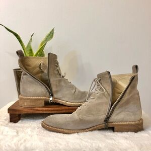 Italian-crafted in luxurious suede. This combat style boot features lace-up styling and an inner side zipper for convenience. Leather sole. Pull tab at the back. Made in Italy of the finest Italian leather, Verio Cuoio. See pics for signs (minimal) of wear. Water resistant.