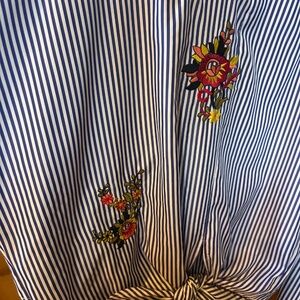 Women's Davi & Dani Top, blue and white stripe with floral embroidery, button detail on sleeves, knotted waist, scoop neck, size large