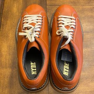 Step out in style with these vibrant orange leather bowling shoes. Perfect for casual outings at the bowling alley, these shoes offer both comfort and a bold look.