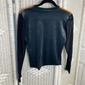 Rare Y2K-era Scoop! long sleeve top featuring a vivid Japanese geisha print on a striking orange front panel. Semi-sheer black sleeves with subtle shimmer and a solid black back. Slim, stretchy fit with a deep V-neckline and lightweight fabric. A bold, collectible piece that captures early-2000s statement fashion and artistic print trends.