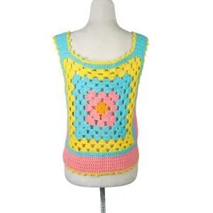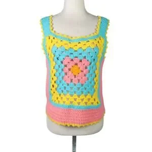 Vintage 70s Blue Yellow Pink Granny Square Crochet Knit Sweater Vest M