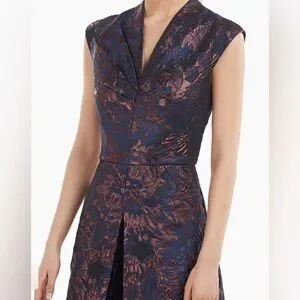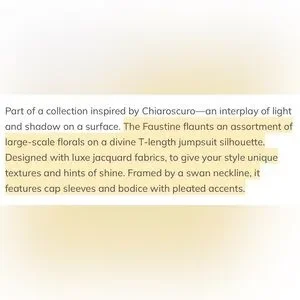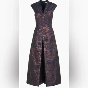 Stunning T-length jumpsuit designed with luxe jacquard fabrics. Swan neckline,cap sleeves and bodice with pleated accents.