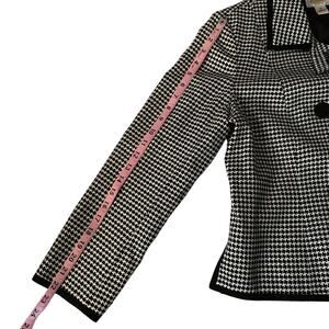 Features: Vintage; 90s; wool blend; cropped shorter length; double breasted; button front; houndstooth tweed; heritage plaid; collared; black trim; split sides; long sleeve with split cuffs; fully lined; sewn in hidden shoulder pads; no pockets; princess seams; classic; career; professional; office; church; dark academia; old money; professor; librarian; fall; winter; spring; summer; all seasons; clueless; mean girls