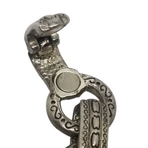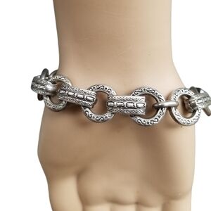 Lovely vintage bracelet by Premier Designs is silvertoned with lovely designs etched all along bracelet. Bracelet is a lovely bookchain style design. Piece has a magnetic clasp that blends right in with the rest of the bracelet, it measures 8-1/2 inches total length. Excellent condition.