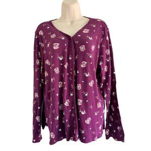 Charter Club Intimates woman's burgundy long sleeve button up pajama top. Top is done in a white dove with pink cage and red rose print. It's made of 100% cotton and is a woman's size XL.