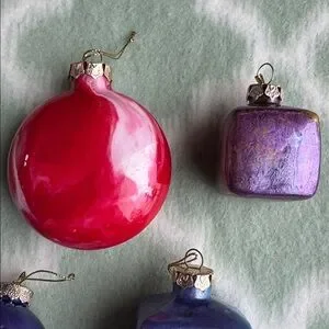 These are handmade glass Christmas ornaments. They appear to be made using a paint pouring or marbling technique, which creates a unique, swirled pattern on each ornament. The ornaments come in various shapes and sizes, including spheres and cubes. Also different colors, gorgeous!