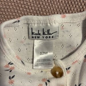 Charming kids set by Nicole Miller. White floral top with ruffle details and wooden buttons. Paired with blue shorts. Perfect for casual outings.