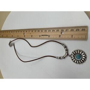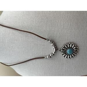 Southwest Silver and Turquoise Sunburst Pendant Necklace on Brown Cord