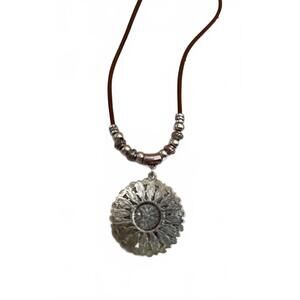 Pendant hangs on a brown cord with silver tone bead accents.