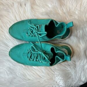 Stylish teal sneakers with yellow accents. Perfect for sports and casual wear.
