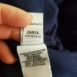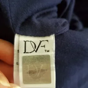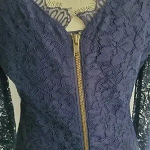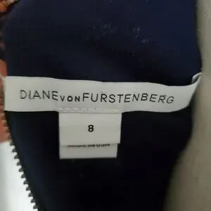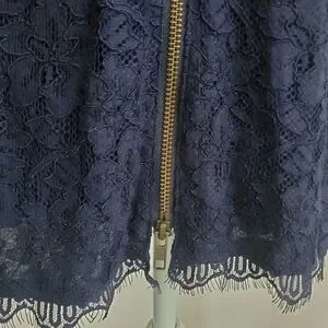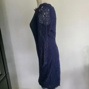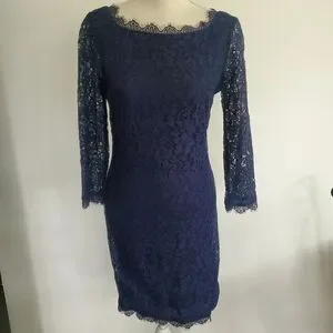 Diane Von Furstenberg "Zarita" navy lace dress with double back zipper that comes all the way undone, scalloped hemlines, and unlined sleeves.