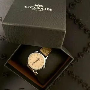 Stylish Coach watch with a brown and taupe strap. Features a sleek silver dial. Ideal for any occasion. Like New - rarely worn, works well with a battery. Offers are welcome.