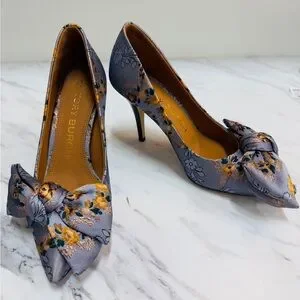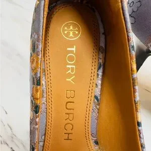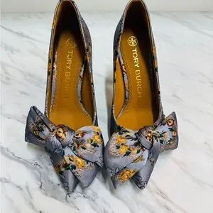 Chic Tory Burch heels with floral pattern. Features elegant bow detail. Perfect for stylish outings.