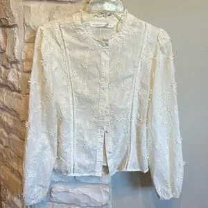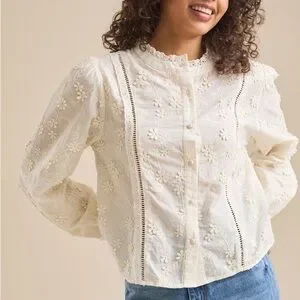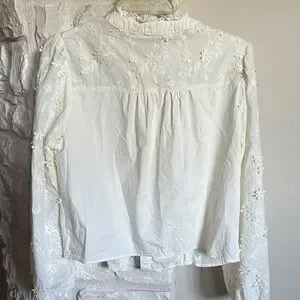 Elegant white top with floral embroidery. Features long sleeves and delicate lace details. Perfect for a chic look.