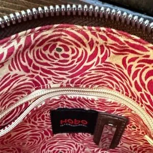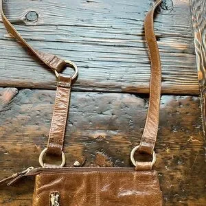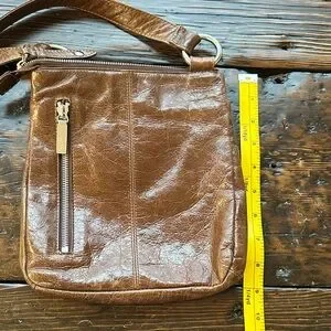 Stylish brown leather crossbody bag. Features front zipper pocket. Durable and chic design.