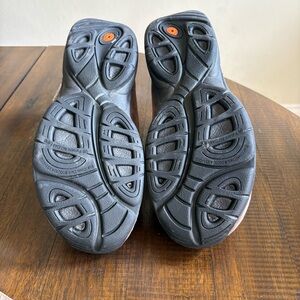 Comfortable slip-on clog style shoe with black soles and featuring the Merrell name and logo. Gently worn. Soles are in great condition.