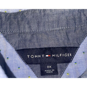 The Women's Tommy Hilfiger Blue Chambray Popover Collar Shirt in size 0X is a stylish and versatile piece perfect for various occasions such as travel, casual outings, and workwear. Made from 100% cotton with a chambray fabric type, this shirt features a classic fit, long sleeves with roll tab the strap for roll tab has been cut off see photo, and a polka dot pattern for a fun and colorful touch. The collared neckline and pullover closure add a touch of preppy style, while the blue color makes it a perfect addition to your fall and spring wardrobe.