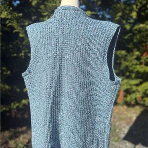 Beautifully handcrafted knit vest in a soft blue flecked yarn. This minimalist, open-front style layers effortlessly over blouses, dresses, or turtlenecks for a cozy yet polished look. A true slow-fashion staple with timeless texture and warmth.
