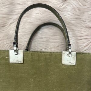 Salvatore Ferragamo canvas olive green handbag perfect for any occasion. It has a sign of wear Features a sleek design with sturdy handles. Ideal for adding a touch of elegance to your outfit.