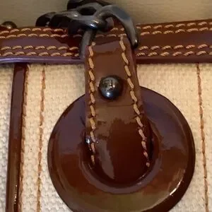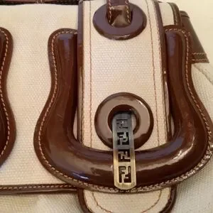 Fendi summer bag in cotton fabric with brown patent finishes. No damage or visible signed of wear. Excellent vintage bag!