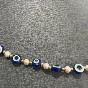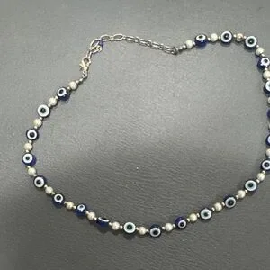 This elegant necklace features striking blue evil eye beads, perfect for adding a touch of mystique to any outfit. The intricate design is both stylish and meaningful.