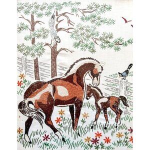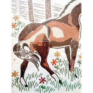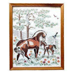 Horses On Farm Thread Yarn Art Framed 1960-70s Antique Original Artwork SS