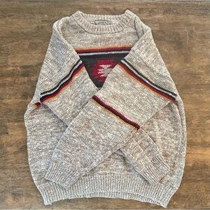 Rare vintage American Eagle Outfitters men’s sweater (late 90s / early 2000s era). Features a bold Southwest / Aztec inspired knit pattern across the chest and sleeves in red, navy, and olive tones on a neutral marled gray base. Ribbed crewneck, cuffs, and hem.