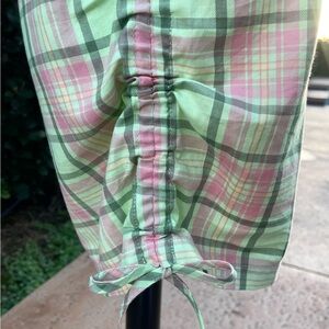 We love the retro feel of this green and pink plaid dress from THE RAGGED PRIEST. Perfectly plaid mini dress. Ruched at the sides with adjustable tie accents at the mini-length hem. Straight neck silhouette fitted with adjustable tie cuffs at the short puff sleeves and elastic banding at the shoulders.