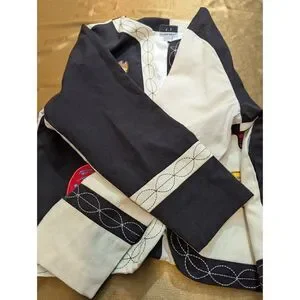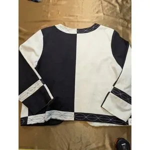 Arty, playful, and one-of-a-kind. Linen/viscose jacket with colorful appliqué cats, contrast whip-stitch trim, and a black/cream colorblock design. Fully lined. Likely late 90s/Y2K era, but I cannot be 100% sure. (But yeah, the cats look a *lot* like some other famous cats of that era. It's not that artist, though -- just similar!)