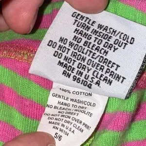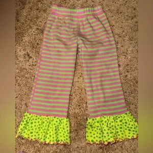 Adorable vintage Miss Tee-V-Us ruffle pants featuring bright pink and green stripes with lime polka dot ruffle hems. Fun boutique-style flare design — perfect for photos, playdates, or pairing with holiday or spring tops!