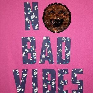 Member's Mark Girl's My Favorite Sweatshirt Size 10/12. The sweatshirt is 60% Cotton and 40% Polyester. Machine washable. Long sleeves. Multicolored. Sequin detailing. Sequins flips up to change look/design. The front says "No Bad Vibes". The colore is slightly different than the pictures depict. The color is closest in the picture with the tags. With the garment laying flat, the measurements are as follow: armpit to armpit is 16 inches and from back of the neck to bottom of the sweatshirt is 19 inches. Preowned but in good condition.