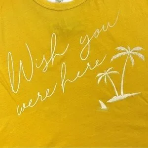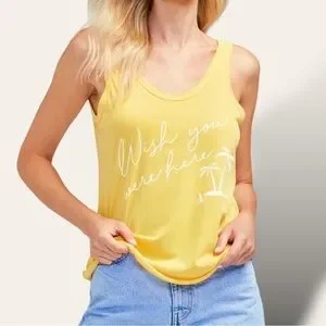 Bring on all the fun in this light and breezy Wildfox Wish You Were Here Tissue Jersey Layla Tank in a sunny goldenrod color with white script.