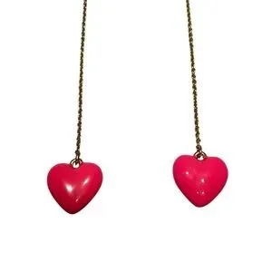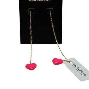 These BaubleBar earrings feature vibrant red heart-shaped charms that dangle elegantly from delicate metal chains, creating a striking minimalist design. The bold red color adds a pop of color to any outfit, making them a perfect accessory for both casual and formal occasions.