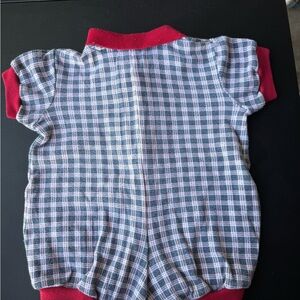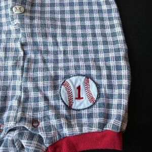 Adorable plaid baby romper with red collar and cuffs. Features a baseball patch detail.