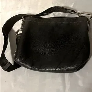 Elegant Coach crossbody bag in dark leather. Features a secure front pocket and adjustable strap. Ideal for everyday use.