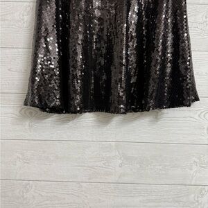 Black sequin mini skirt with 3” waistband, invisible side zipper, flowing skirt and black lining. Size S W 28-32” L 20” Like new condition. See pictures for details and normal wear and tear.