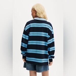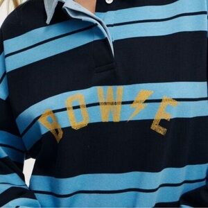 NWT Women’s Cotton On David Bowie striped polo, 3 buttons at neck with denim collar, Bowie across chest in gold lettering, Carolina blue and navy stripes, long sleeve with elastic cuff, oversized fit, 23” PTP, 27.5” length, 100% cotton, brand new condition, smoke free home