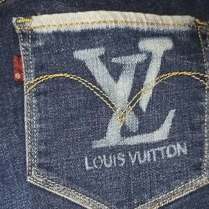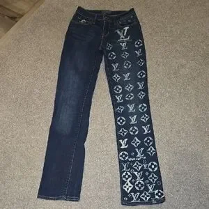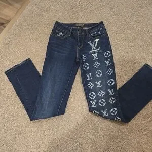Chic Levi's skinny jeans in dark blue. Features a unique patterned design on one leg. Customized style for a trendy look.