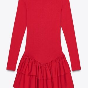 Chic red mini dress. Long sleeves. Ruffled hem. Perfect for any occasion.