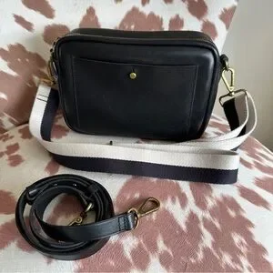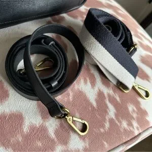 Two straps included—one in matching black leather, one black and white wide webbed.